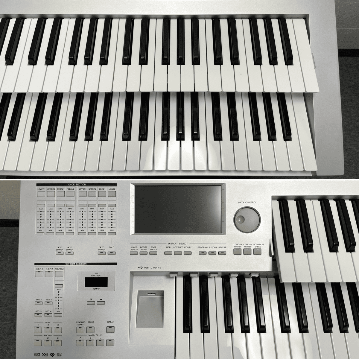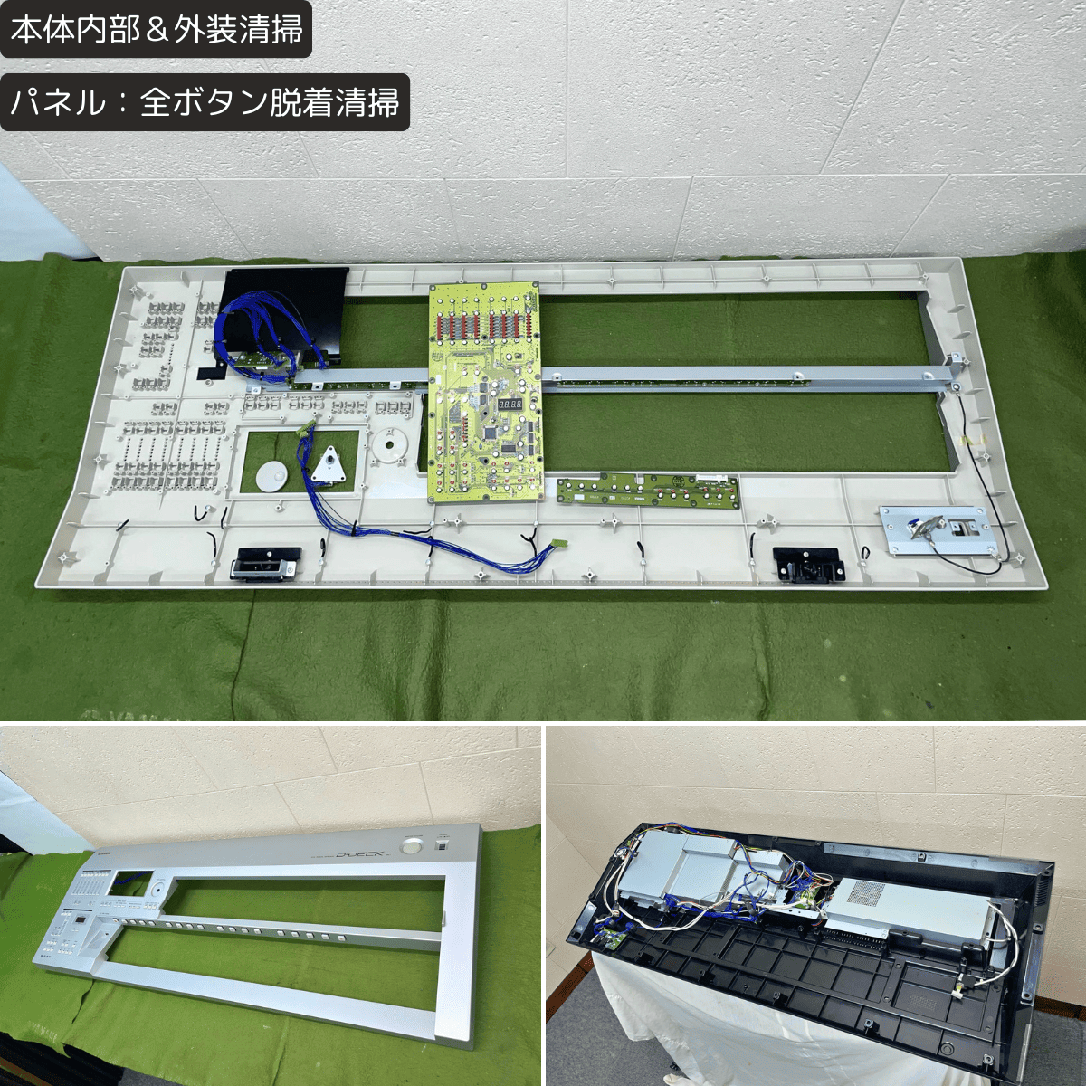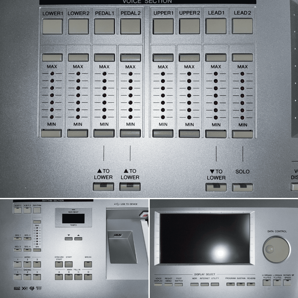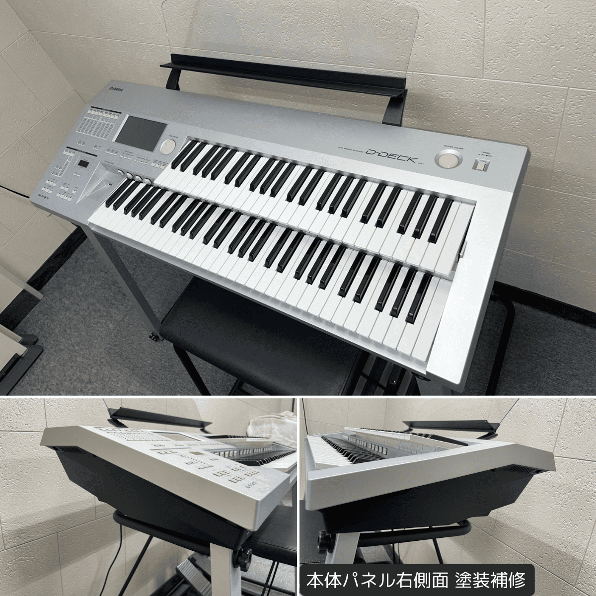 | 本体 | ・内部&外装清掃 ・パネル:全ボタン脱着清掃 ・DATA CONTROL箇所:ロータリーエンコーダ交換 ★ ・タクトスイッチ7箇所交換 ★: ①LOWER2 – MAX ②PEDAL1 – MAX ③UPPER2 – MAX ④LEAD1 – MIN ⑤LEAD2 – MAX ⑥SOLO ⑦MAIN/FILL IN – B ・液晶画面:清掃&フラットケーブル接点清掃 ・各ジャック箇所:接点洗浄剤注入 ・本体パネル&キーボードスタンド:小キズ箇所筆差し補修 ・本体パネル右側面:塗装補修 |