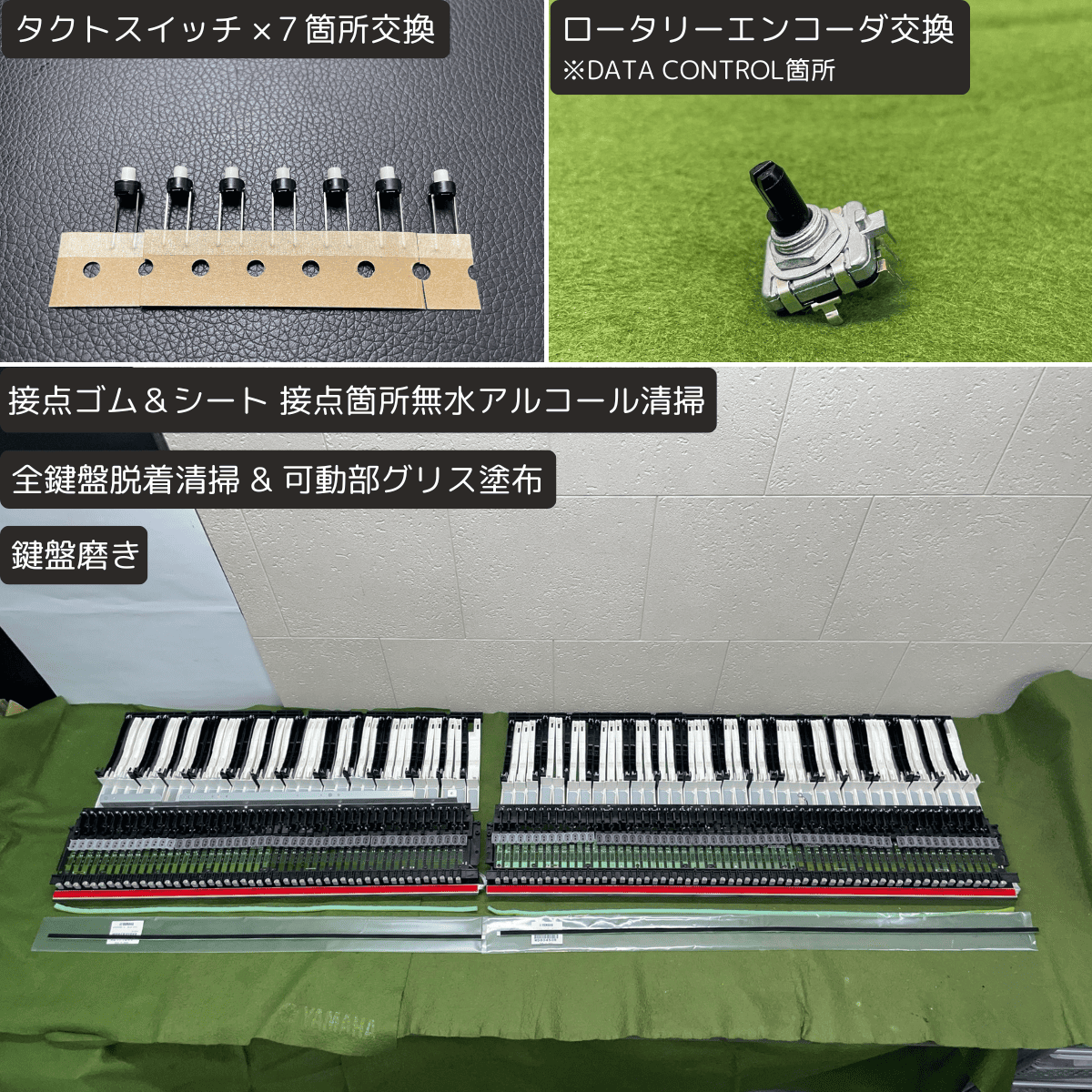 | 鍵盤 | ・全鍵盤脱着清掃 ・可動部グリス塗布 ・接点シート&ゴム 接点箇所無水アルコール清掃 ・ストッパーU(上下鍵盤)新品交換 ★ ・鍵盤磨き |